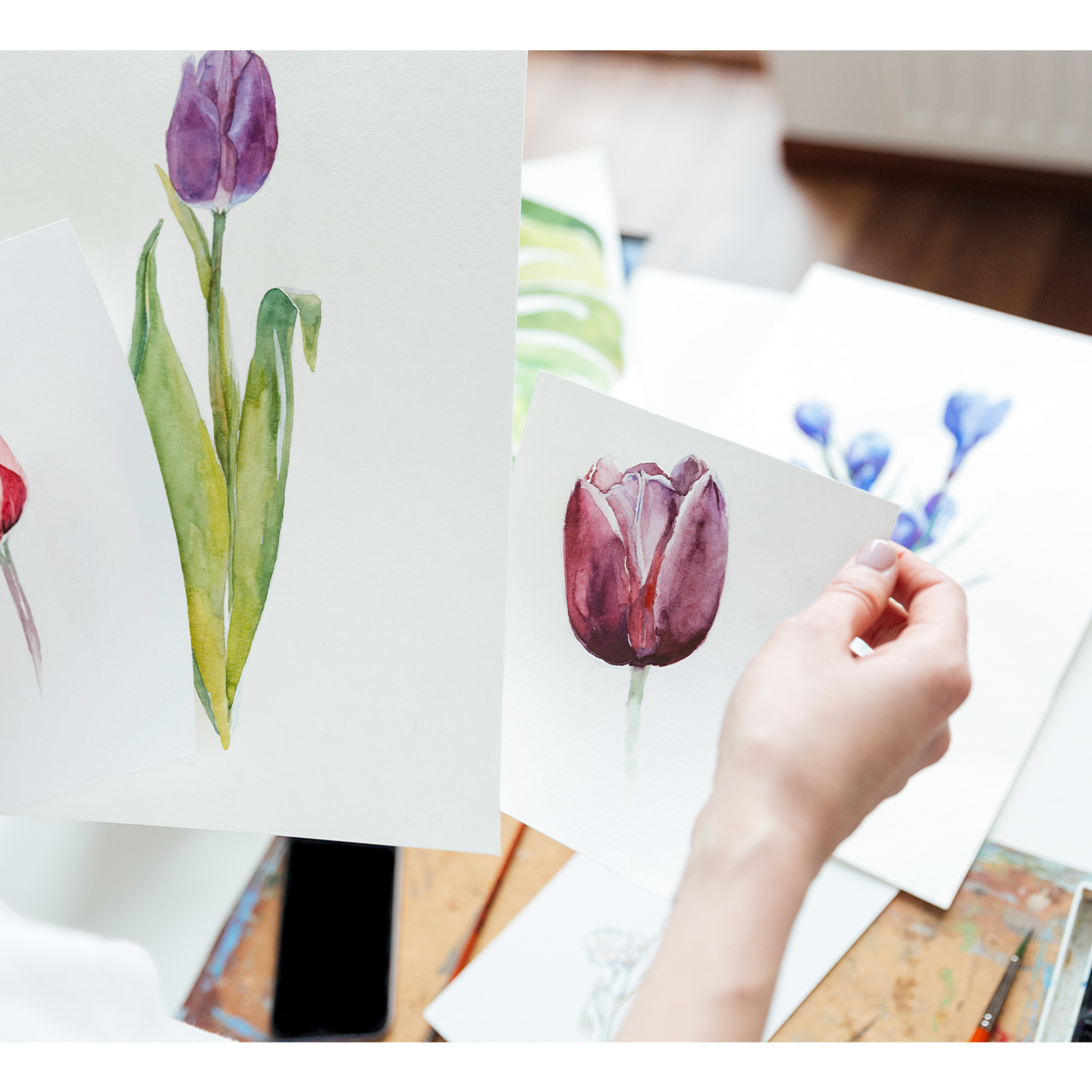 学习内容:水彩基本笔法与渐层控制、色彩冷暖与调和原理、构图与造型基础、花卉与静物练习、结合 AI 进行创意构图草图探索、材料选择与装裱方法。